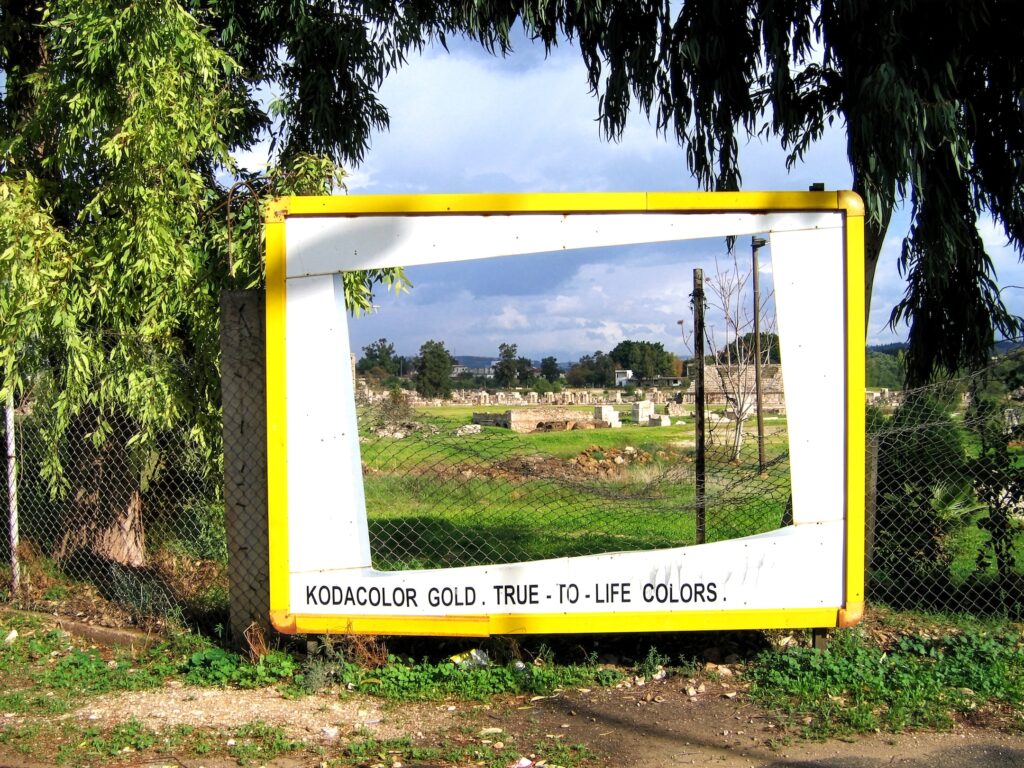 Finally, never-before-seen photographic works shot in Lebanon, the West Bank, and Syria by Ahwesh from as early as 1990 reflect her personal ties to these territories as well as her distance from them, as she assumes the perspective of an American visitor. In newdiptych compositions the artist pairs images of Palmyra’s Temple of Bel before ISIS’ destruction with Trump’s prototypes at the US-Mexican border, and a photograph of her father’s ancestral village with one of her younger self sitting by a museum in Palmyra. Other works featuring old billboard ads for Kodak film slides and Nokia cellphones inadvertently trace parallels between the gradual disappearance of civilizations and the transiency of technologies that aim to offer advancements.