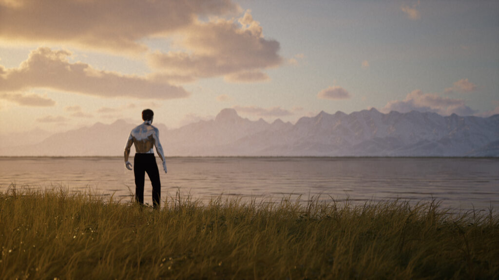 The animated landscape is based on actual satellite imagery and terrain mapping databases of the area combined with other elements such as the rising waters and some vegetation or fictionalized projections of the area under extreme changes in climate, while the character’s movements use motion capture of Phuntsog’s actions.